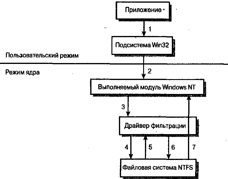 Рис. 10.2. Использование точки повторной обработки Как показано на рис. 10.2, для реализации возможностей точки повторной обработки применяется несколько этапов. 1. Средствами подсистемы Win32 приложение отправляет запрос на открытие файла. После проверок подсистема Win32 отправляет запрос выполняемому модулю Windows NT. Диспетчер ввода-вывода Windows NT создает пакет IRP (IRP_MJ_0PEN) и отправляет его NTFS. Пакет IRP перехватывается драйвером точки повторной обработки в файловой системе. Драйвер фильтрации перехватывает пакет IRP, определяет процедуру завершения, которая будет вызвана после завершения обработки пакета IRP, и средствами диспетчера ввода-вывода отправляет пакет IRP драйверу NTFS. Пакет IRP достигает файловой системы, которая обрабатывает пакет IRP_MJ_0PEN, находит необходимый файл или каталог и отмечает ассоциированный с ними тег точки повторной обработки. Затем NTFS помещает тег и данные повторной обработки в пакет IRP и неудачно завершает обработку пакета IRP со специальным кодом ошибки. Далее подсистема ввода-вывода вызывает каждый драйвер фильтрации (по одному за раз), который зарегистрировал процедуру завершения для этого пакета IRP. Процедурой завершения каждого драйвера фильтрации рассматривается код ошибки и тег повторной обработки в пакете IRP. Если драйвер не распознает тег как собственный, он вызывает диспетчер ввода-вывода, который должен вызвать процедуру завершения следующего драйвера. Предположим, что один из драйверов распознал тег точки повторной обработки. После этого драйвер может использовать данные точки для повторной отправки пакета IRP, измененного в соответствии с данными, предоставленными точкой повторной обработки; например, перед повторной отправкой пакета IRP может быть изменен путь к файлу. 7. Файловая система NTFS завершает обработку повторно отправленного пакета IRP. Типичным примером может служить изменение пути и успешное завершение запроса. Диспетчер ввода-вывода завершает запрос на открытие файла, после чего через процедуры завершения может быть вызван каждый драйвер фильтрации файловой системы. Наконец обработка пакета IRP завершается, и приложение получает дескриптор файла. Если ни один драйвер фильтрации не распознает тег точки повторной обработки, запрос на открытие файла или каталога завершается неудачно. Одним приложениям требуются сведения о наличии точек повторной обработки, в то время как другим они совершенно не нужны. К последним, например, относятся приложения Microsoft Office, поэтому при открытии документа Word, PowerPoint или Excel функции точки повторной обработки, которая перенаправляет запрос на открытие на другой том, во внимание не принимаются. Тем не менее некоторым приложениям, которые рекурсивно просматривают дерево каталогов, требуются сведения о возможности создания зацикленных путей. Приложения могут аннулировать функции точек повторной обработки, передав соответствующие параметры (FILE_OPEN_REPARSE_POINT) 1 в запросах CreateFile, DeleteFile и RemoveDir. Именно таким образом можно создавать, удалять и модифицировать точки повторной обработки. Функция GetVolumelnf ormation возвращает флаг FILE_SUPPORTS_REPARSE_POINTS. Функции FindFirstFile и FindNextFile возвращают флаг FILE_ATTRIBUTE_ REPARSE_POINT для указания на наличие точки повторной обработки. Все точки повторной обработки тома NTFS индексируются в файле, который называется $Index и находится в каталоге \$Extend. Таким 