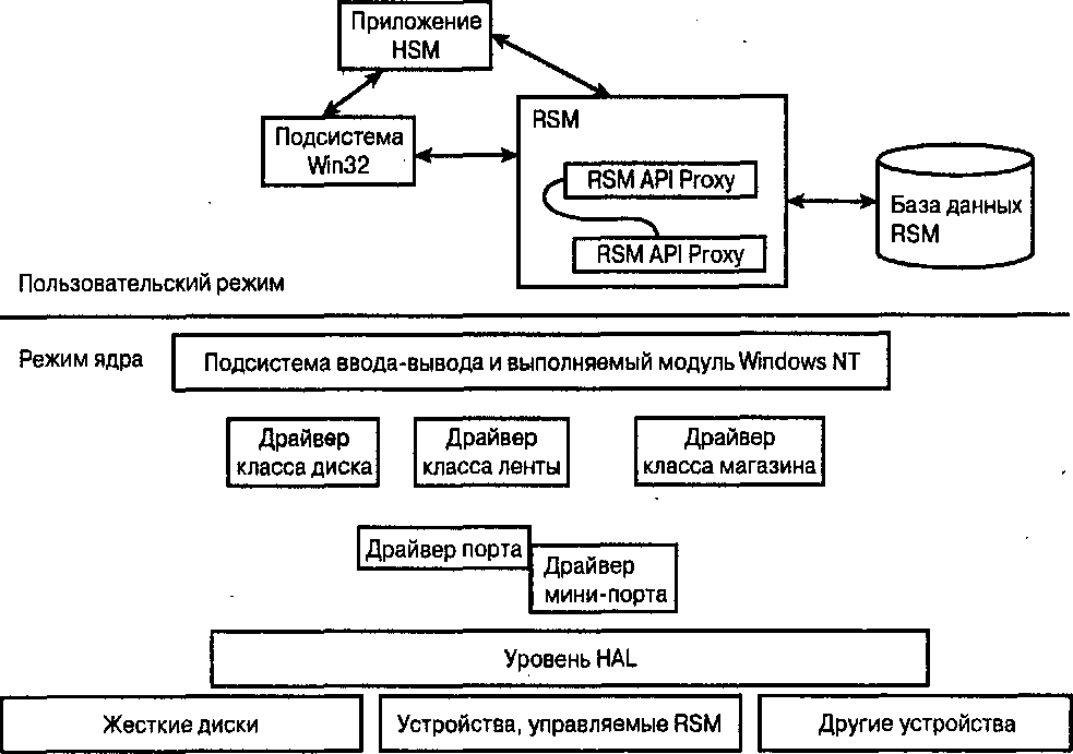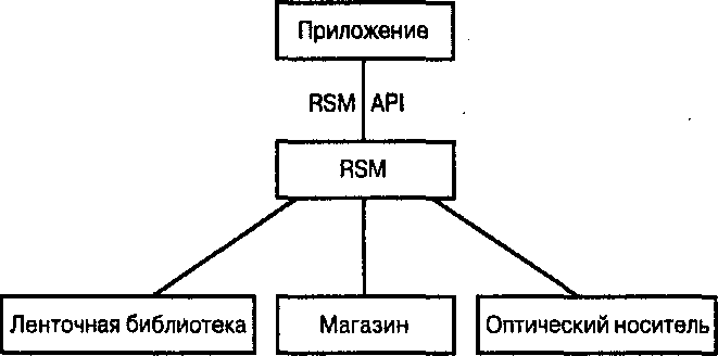 Рис. 10.3. Архитектура HSM и RSM На рис. 10.3 показана схема RSS и архитектура управления сменными носителями (Removable Storage Management – RSM). Приложение HSM использует программный интерфейс приложений RSM (см. раздел 10.2.11). Служба RSM – это подсистема пользовательского режима, обладающая собственной базой данных для отслеживания носителей и устройств. 10.2.11 Управление сменными носителями Служба управления сменными носителями (RSM) позволяет приложениям управлять всеми сменными носителями в корпоративной сети, вне зависимости от типа сменного носителя. Интерактивные носители обычно находятся в различных устройствах, включая магазины, ленточные автоматы и роботизированные библиотеки. Неинтерактивные носители, как правило, лежат на полке. На рис. 10.4 показана архитектура и преимущества службы управления сменными носителями. Приложение работает с единственным интерфейсом, который предоставляется RSM. Сама RSM взаимодействует с интерфейсами новых и временно подключаемых устройств.