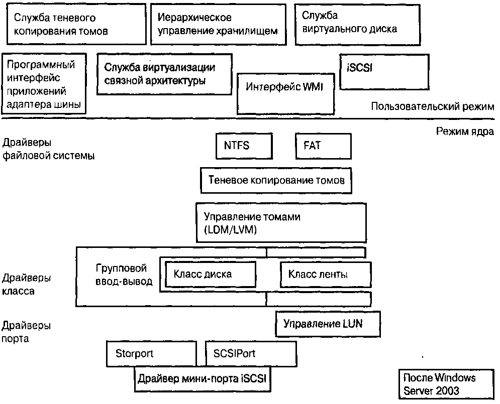 Рис. 10.5. Возможности подсистемы хранения данных в Windows Server 2003 и будущих версиях ме хранения данных. Чтобы проиллюстрировать объем работы, выполненный разработчиками Microsoft, обратите внимание на рис. 10.5. Незакрашенные прямоугольники на рис. 10.5 демонстрируют возможности подсистемы хранения Windows Server 2003, рассматриваемые в этой главе. Закрашенные прямоугольники показывают компоненты, которые с высокой долей вероятности появятся в будущих версиях Windows Server. Конкретная версия будущей операционной системы еще не известна. Судя по сложившимся традициям Microsoft, возможно несколько вариантов. Поставка вместе со следующей основной версией Windows NT (на данный момент она имеет кодовое наименование Microsoft Longhorn и будет выпущена в 2005 году). Поставка в составе пакета Windows Resource Kit или пакета обновлений (Service Pack). Поставка в виде обновления, доступного для загрузки с Web-узла Microsoft (например, через службу Windows Update). Поставка через независимых производителей аппаратного и программного обеспечения; например, Microsoft предоставит соответствующий программный пакет партнерам, которые используют его в собственных системах. 10.3.1 Модель драйверов Storport Как отмечается в главе 1, Windows NT предоставляет уровень драйверов устройств, который позволяет достичь эффективного и масштабируемого ввода-вывода. Дополнительная информация о стеке ввода-вывода Windows и всех его уровнях подробно описана в главе 1. Достаточно сказать, что одним из этих уровней является уровень драйверов порта. Драйвер порта отвечает за получение запросов ввода-вывода от верхних уровней, подготовку блоков команд SCSI и передачу запросов непосредственно устройству. Драйверы порта отвечают за хранение информации, которая позволяет осуществлять взаимодействие с устройством. Создавая блоки команд SCSI и обрабатывая результаты их выполнения, драйверы порта используют службы драйвера мини-порта, который создается производителем устройства. До выхода Windows Server 2003 компания Microsoft предоставляла драйвер SCSIPort и оставляла производителям возможность создавать драйвер мини-порта SCSIPort, отвечающий за поддержку устройств Fibre Channel и SCSI. Отдельный установочный образ Windows NT мог содержать несколько драйверов мини-порта от различных производителей. Драйвер SCSIPort перенаправлял запросы соответствующему драйверу мини-порта. При использовании этого подхода возникал ряд проблем. В описываемой модели предполагается, что устройства Fibre Channel обладают возможностями, аналогичными функциям устройств SCSI, однако это не соответствует действительности, как и то, что новые устройства SCSI-3 подобны более старым устройствам SCSI. Чтобы упростить задачу создания драйвера мини-порта, драйвер SCSIPort поддерживает однопоточную, а не дуплексную модель ввода- вывода. Это не позволяет системе достичь необходимой и возможной скорости обмена данными. Драйвер порта содержал определенную информацию, которая не передавалась драйверу мини-порта, чтр требовало от него получения этих данных с помощью нескольких вызовов. В частности, это относится к спискам сборки/разборки. Не желая мириться с ограничениями стандартной модели, производители устройств Fibre Channel создавали единый драйвер, в котором объединялись функции драйверов порта и мини-порта, или заменяли драйвер порта собственным драйвером. Поскольку этот процесс требовал тщательного анализа функци