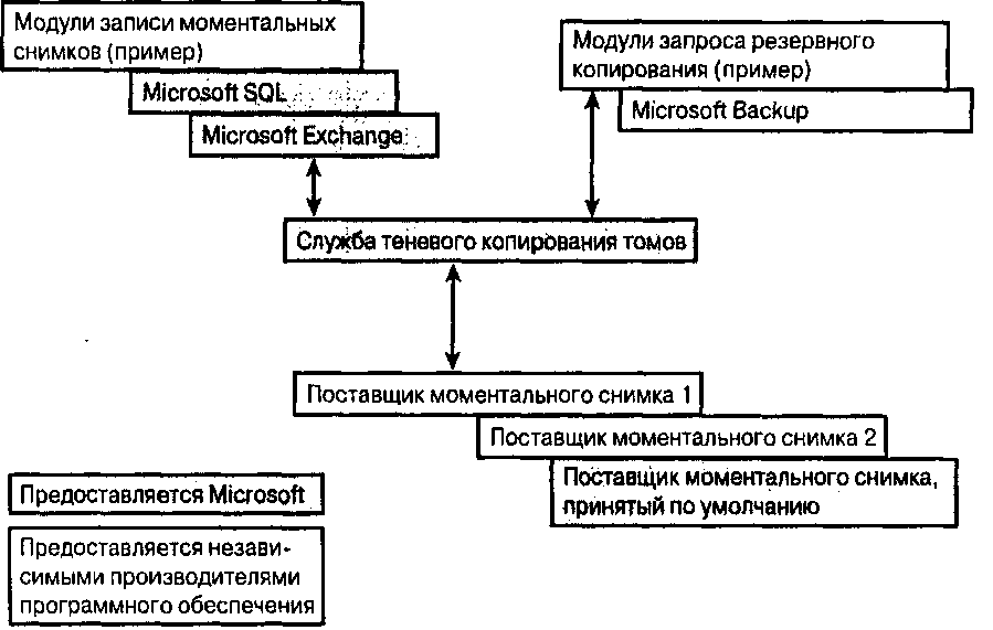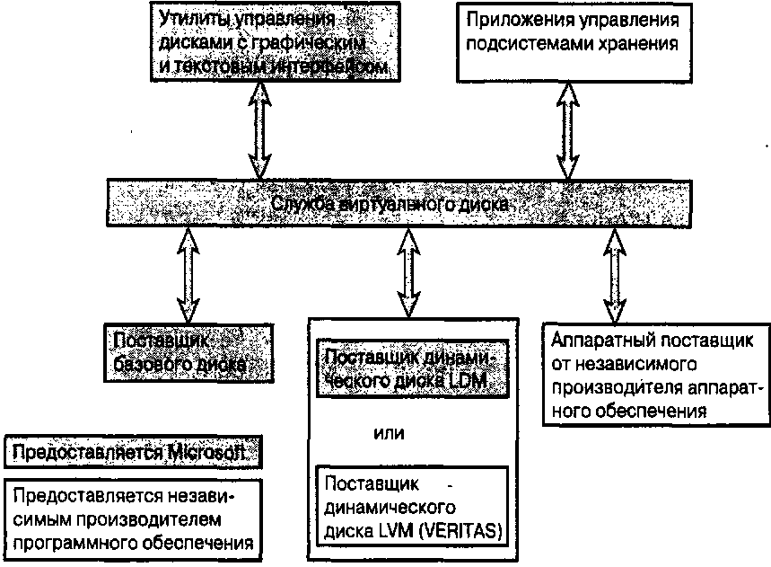 Рис. 10.6. Служба теневого копирования томов Служба теневого копирования томов создана компанией Microsoft и предоставляет API приложениям резервного копирования, позволяющий запросить создание моментального снимка. Служба обеспечивает задержку операций ввода-вывода, обнуление кэшей и приостановку ввода-вывода системы и приложений, что позволяет создать копию тома в определенный момент времени. Модули записи теневого копирования – это приложения, например Microsoft SQL Server или Microsoft Exchange, имеющие специальный код для интеграции в службу теневого копирования. Желательно, чтобы все приложения, включая базы данных и приложения планирования ресурсов уровня предприятия, предоставляли поставщика записи теневого копирования для интеграции со службой создания моментальных снимков. Компания Microsoft предоставляет такие модули для Active Directory, SQL Server и Microsoft Exchange. Модули запроса теневого копирования – это приложения резервного копирования или приложения, которые инициируют создание копии тома, например копии данных для тестирования. Одни из этих модулей создаются компанией Microsoft, другие – независимыми разработчиками программного обеспечения. Приложения резервного копирования, которые предоставляются в Windows Server 2003, также являются модулями запроса теневого копирования. Поставщики моментальных снимков – это компоненты, которые фактически создают моментальный снимок или копию тома. Компания Microsoft предоставляет поставщика, принятого по умолчанию, который создает копию тома с помощью метода копирования при записи. Ожидается, что производители систем хранения будут создавать собственных поставщиков для создания моментальных снимков. Архитектура допускает использование различных схем для создания моментального снимка, включая разбивку зеркала на аппаратном уровне. Обратите внимание, что инфраструктура, разработанная Microsoft, позволяет создавать только один моментальный снимок. Тем не менее она соответствует требованиям независимых производителей программного обеспечения, так как предоставляет возможность управления несколькими моментальными снимками и позволяет монтировать моментальные снимки только для чтения. Дополнительная информация о службе теневого копирования томов приведена в главе 5. Набор SDK для службы теневого копирования томов доступен от компании Microsoft при условии подписания соглашения о неразглашении. 10.3.3 Служба виртуального диска Служба виртуального диска (Virtual Disk Service – VDS) представляет собой интерфейс управления, интегрированный в Windows Server 2003 и предназначенный для предоставления уровня абстракции при виртуализации дисков независимо от ресурса виртуализации. Перед описанием архитектурных особенностей VDS стоит рассмотреть причины появления этой службы. Основным мотивом была необходимость в предоставлении администратору возможности автоматизированного и ручного управления следующими операциями: формирование тома хранилища, создание на его основе массива RAID 5 объемом не менее 10 Гбайт; формирование тома хранилища, увеличение его объема до 10 Гбайт и создания простого тома без возможностей массива RAID. Другими словами, администратор должен иметь возможность выделять хранилище под моментальные снимки, резервировать снимок и освобождать хранилище, возвращая его в пул свободных хранилищ. Служба виртуального 
