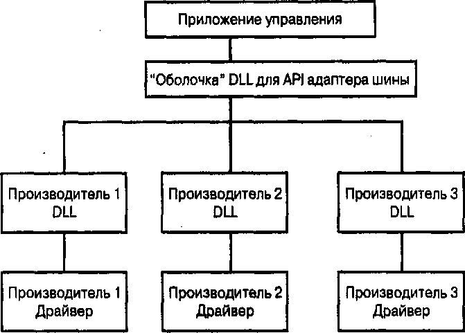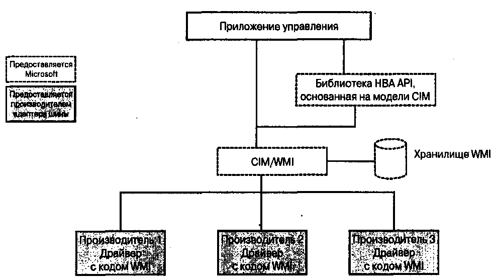 Рис. 10.8. Программный интерфейс адаптера шины от ассоциации SNIA Универсальная динамически подключаемая библиотека API адаптера шины, поддерживаемая SNIA. В ней предоставляется стандартный интерфейс для приложений управления. На нижнем уровне библиотека взаимодействует с различными библиотеками, созданными производителями устройств. Динамически подключаемая библиотека от производителя адаптера, которая подключается к DLL программного интерфейса адаптера шины. Библиотека от производителя предоставляет информацию для управления и взаимодействует с драйвером производителя посредством закрытых вызовов управления вводом-выводом. Драйвер устройства, созданный производителем для данного адаптера шины. Хотя такой подход обладает определенными преимуществами, компания Microsoft отмечает некоторые связанные с ним проблемы. ¦ Невозможно эффективно управлять распространением и учетом версий динамически подключаемых библиотек. Это еще один пример ситуации, когда несколько приложений устанавливают собственные библиотеки, потенциально перезаписывая библиотеки, установленные другими приложениями. ш Производитель адаптера шины должен создать не только драйвер устройства и закрытый интерфейс управления вводом-выводом для этого драйвера, но и собственную динамически подключаемую библиотеку, а также внести определенные изменения в библиотеку – оболочку адаптера шины, чтобы предоставить необходимые интерфейсы созданной DLL. Тестирование и сертификация драйверов производителей, в которых используются закрытые вызовы управления вводом-выводом, представляет собой исключительно сложный процесс; например, как можно проверить, что некорректные параметры вызова управления вводом-выводом не приведут к переполнению буфера? Архитектура на первый взгляд выглядит расширяемой, но при более детальном рассмотрении очевидно, что производители адаптеров шины всегда будут «догонять» разработчиков приложений управления, добавляя код, который работает с расширениями, характерными для определенного производителя. Не поддерживается связь и управление в режиме ядра. В архитектуре SNIA требуется, чтобы приложение управления ожидало момента полной работоспособности подсистемы пользовательского режима Windows NT. Но для некоторых операций управления, например для маскировки LUN, необходимо наличие драйвера в режиме ядра, который будет выполнять определенные действия в процессе загрузки операционной системы еще до того, как будет запущена подсистема пользовательского режима. Компания Microsoft предлагает несколько иной метод, который демонстрируется на рис. 10.9 и описан ниже.