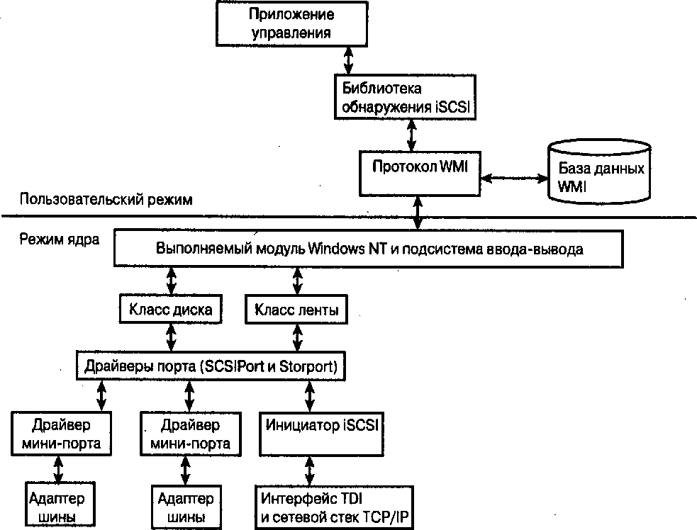 Рис. 10.10. Архитектура протокола iSCSI в Windows NT Библиотека обнаружения динамически отслеживает все изменения и работает как единый репозиторий для всех LUN, обнаруженных любым способом, включая уведомления клиента или порта службой iSNS (Internet Storage Name Service). Библиотека обнаружения предоставляет API для приложений управления, который может использоваться для обнаружения новых LUN и, если возможно, регистрации в обнаруженной LUN. Планы Microsoft по реализации протокола iSCSI включают несколько пунктов. Основное внимание будет уделяться реализации протокола iSCSI в Windows Server 2003. Ожидается, что iSCSI будет доступен в Windows 2000 и Windows ХР. Будет предоставлен код для сервера и клиента iSNS. В качестве основного механизма защиты будет использоваться протокол IPSec. Особое внимание получит реализация инициатора iSCSI. На данный момент не существует-планов по реализации целевого устройства iSCSI для Windows NT. Передача информации между библиотекой обнаружения и инициатором iSCSI будет осуществляться с помощью интерфейса WMI. Кроме того, драйвер порта предоставляет маршрут взаимодействия с ми- ни-портом НСА, а также диспетчерами InfiniBand, например диспетчерами подсетей и подключений. Диспетчер подсети отвечает за управление топологией связной архитектуры через программирование коммутаторов и установку атрибутов НСА. Кроме того, диспетчер подсети предоставляет точку соединения политик управления, связанных с управлением доступом, производительностью и устойчивостью к ошибкам (групповой ввод-вывод). Диспетчер подключений реализует возможности InfiniBand, ориентированные на подключения, а также основанные на политиках методы сохранения целостности данных. 10.4.4 Групповой ввод-вывод в Windows 2000/Server 2003 Групповой ввод-вывод данных поддерживается в Windows 2000 и Windows Server 2003. Компания Microsoft предоставляет производителям инструментарий разработки, поэтому готовые системы доступны только у определенных компаний. Ожидается, что Microsoft внедрит поддержку группового ввода- вывода и для сменных носителей (на данный момент поддерживаются только жесткие диски). Поэтому часть прямоугольника группового ввода-вывода на рис. 10.5 закрашена другим цветом. 10.5 Чего не хватает?Компания Microsoft признала необходимость добавления некоторых возможностей, но никак не обозначила намерения по их реализации. В этом разделе рассматривается ряд технологий и делается попытка прогноза их дальнейшего развития. 10.5.1 Загрузка через SAN Операционная система Windows 2000 поддерживает загрузку через SAN, но в этом процессе существует множество «подводных камней». Компания Microsoft обеспечивает ограниченную поддержку загрузки через SAN. В частности, существуют описанные ниже проблемы.' Все используемое программное и аппаратное обеспечение должно быть совместимо с Windows 2000. Невозможно использовать кольцо Fibre Channel с разделением доступа (Fibre Channel Arbitrated Loop – FC-AL), так как в ядро Windows NT не вносились изменения, позволяющие обрабатывать значительные задержки среды FC-AL при повторной инициализации кольца. Операционная система Windows 2000 требует эксклюзивного доступа к LUN, с которого проводится загрузка. Соответствующая маскировка выполняется на коммутаторе или через управление адаптерами шины. Поставщик оборудования сети SAN должен принимать участие в процессе планирования и гарантировать поддержку в случае возникновения каких-либо проблем. Рекоме