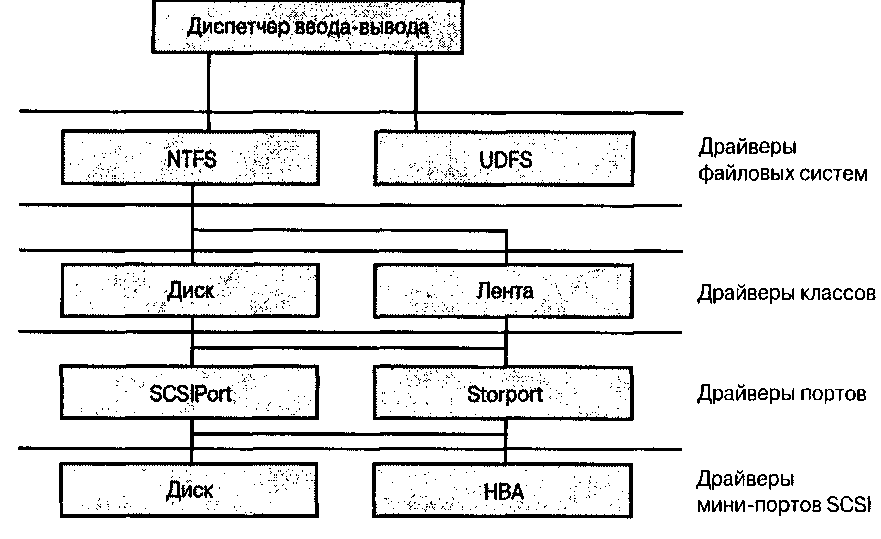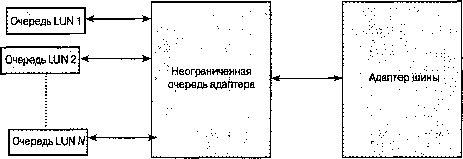 Рис. 2.4. Работа с очередью запросов в модели Storport Все новые возможности имеют минимальный шанс нарушить нормальную работу системы, гак как модель Storport обратно совместима с SCSIPort. Поставщики могут просто перекомпилировать и скомпоновать старый код с библиотекой драйвера Storport, (вместо библиотеки драйвера SCSIPort), не затрачивая усилий на перенос кода на другую платформу. Это позволит использовать новую модель, хотя и не предоставит всех преимуществ, доступных при полноценном переносе. Новая архитектура предоставляет интерфейс, отменяющий необходимость создания «виртуального устройства» (ghost device). Модель SCSI не позволяет приложению запрашивать функции без монтирования модуля мини-порта. В свою очередь, модель Storport не требует создания виртуального устройства, поддерживая запрос функций даже без монтирования этого модуля. Кроме всего прочего, в новой архитектуре улучшен интерфейс с целью обеспечить соответствие требованиям поставщиков систем хранения данных высокого уровня. Особенно это касается поставщиков систем RAID и Fibre Channel. Например, старая модель SCSIPort поддерживала ограниченный набор возможностей по управлению'очередью запросов. Новые устройства, в свою очередь, требуют расширенного управления очередью. Модель Storport поддерживает использование 254 запросов на каждую логическую единицу каждого адаптера. Максимальное количество запросов на адаптер ограничено только количеством логических единиц, поддерживаемых адаптером (рис. 2.4). Еще одно преимущество иерархической структуры в модели Storport заключается в Етличии интерфейса управления для конфигурации и управления высокоуровневыми устройствами хранения данных. Этот интерфейс основан на инструментарии управления Windows (Windows Management Instrumentation – WMI). Интерфейс используется другими элементами Windows, например интерфейсом управления для командной строки. Технология WMI рассматривается в главе 7. Интерфейс управления WMI поддерживает четыре различных класса WMI. Класс адаптера шины. На компьютере может быть установлено несколько таких адаптеров и для каждого из них создается экземпляр такого класса. Класс каналй. Каждый адаптер может иметь один или несколько каналов, которые соединяют адаптер с его физическими дисками. Класс массива дисков. Каждый канал может иметь один или несколько массивов дисков или не иметь таковых вообще. Класс физического диска. Каждый адаптер может иметь один или несколько подключенных физических дисков или не иметь таковых вообще. 2.7 Сложности практической реализацииВ новой модели драйверов Storport оптимизированы функции ввода-вы- вода и общая производительность системы управления. Однако системный администратор и менеджеры по закупкам в информационных отделах компаний должны знать, что новая модель драйверов Storport доступна только в Windows Server 2003. Тем же, кто сделал ставку на платформу Windows, рекомендуется ознакомиться с планами поставщика оборудования по переходу к модели Storport и наравне с этим проанализировать поддержку устройств конкретного поставщика в Windows 2000, включая подробности реализации драйвера. Особое внимание необходимо обратить на параметры пропускной способности системы при использовании модели драйверов SCSIPort (которая скоро станет устаревшей), если эта модель поддерживается поставщиком. Кроме того, стоит обратить внимание на наличие прод